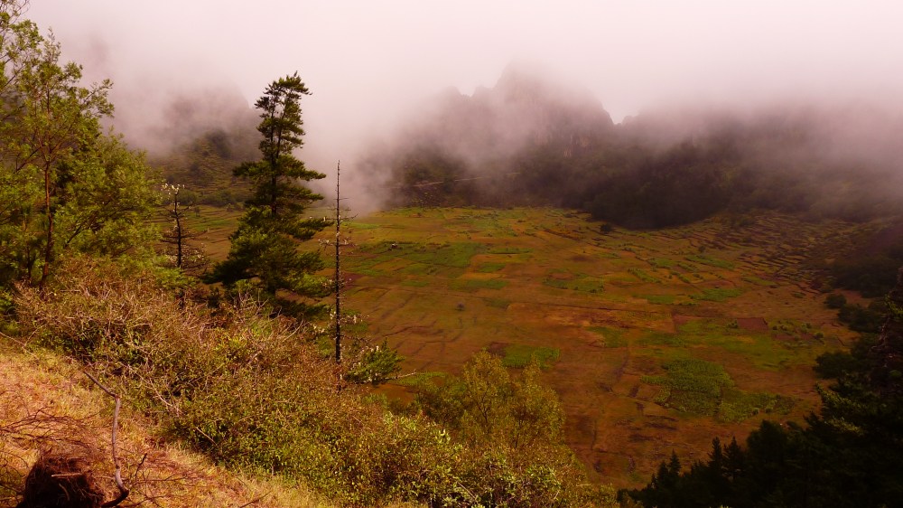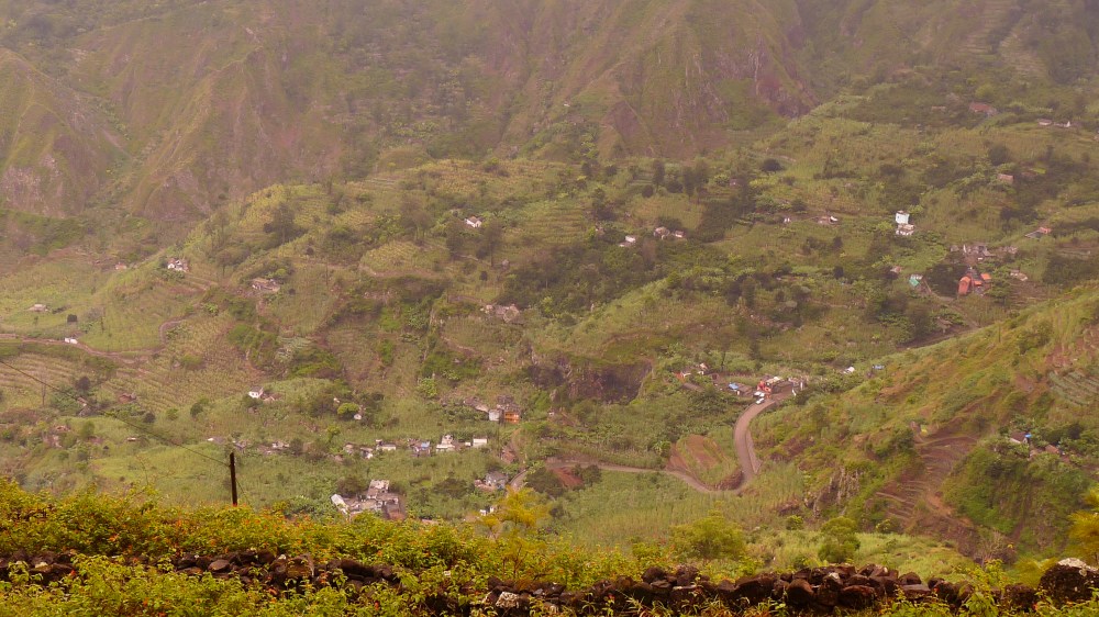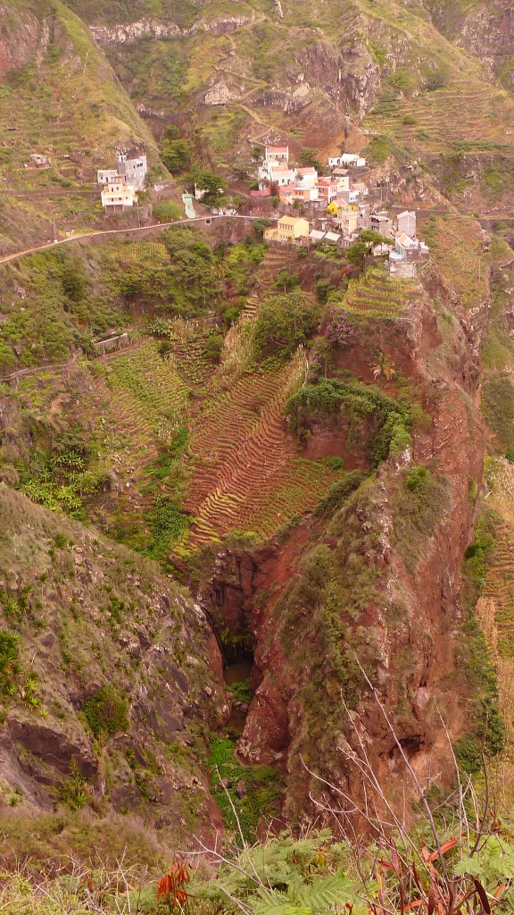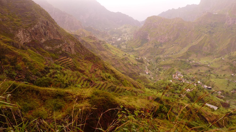 Nous avons pris le ferry qui part de Mindelo jusqu’à Porto Novo. Là, il y a pleins de taxi (ou ‘aluguer’) qui attendent à l’arrivée du ferry pour vous emmener. Nous avons partagé un grand aluguer avec 5 autres touristes (avec qui nous avons finalement passé les 3 jours tellement on s’est bien entendus) qui nous emmène à 1200m au cratère de Cova via l’estrada corda, un chemin pavé (comme tous sur l’île) au milieu d’un décor désertique (beaucoup plus joli que par la nouvelle route le long de la mer, ça vaut la peine de demander au chauffeur de prendre cette route), d’où part la randonnée vers la vallée de Paúl. Cova étant au sommet, quasiment toute la randonnée se fait en descente. Durant 5 heures, nous avons marché autour du cratère de Cova et descendu la vallée de Paúl (prononcer pa-oul) avec vue sur l’océan dans le fond. Il n’est pas rare le matin que les nuages soient encore pris dans la vallée. Mais plus vous descendez, plus cela se dégagera et offrira une vue magique. On est impressionnés par le paysage, des terrasses, des pics, des petites maisons. Une capverdienne avec au moins 10 kg de bois sur la tête nous dépasse pieds nus dans la descente. La rando se termine à Vila das Pombas. De là, il y a moyen de prendre un aluguer jusqu’à Ponta do Sol ou Ribeira Grande (moins joli) pour loger. Nous avons dormi à Ponta do Sol, jolie petite bourgade avec quelques « pensions » et restos.
